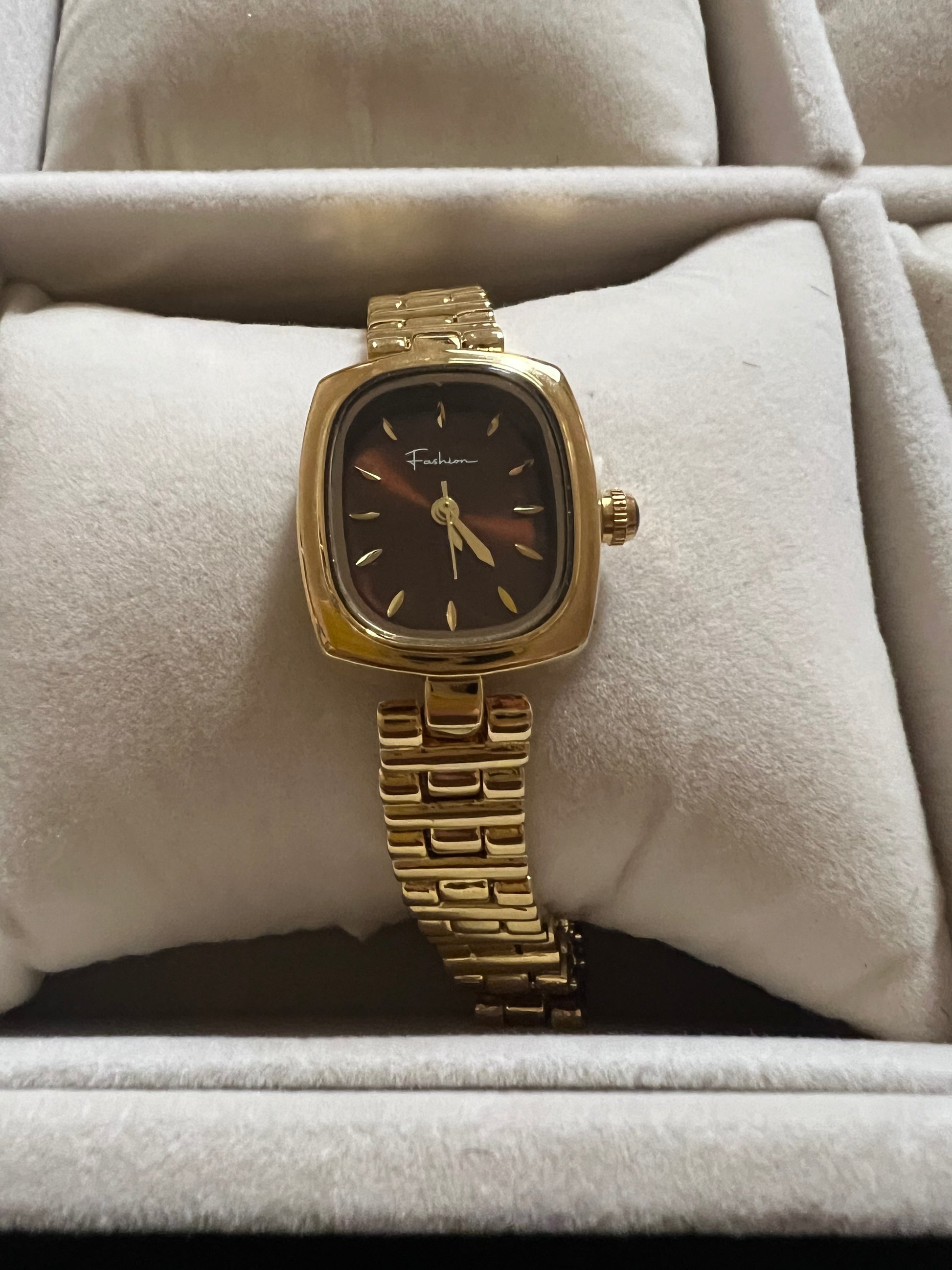 Elevate your look with this 18k gold-plated stainless steel timepiece, crafted to remain tarnish-free.